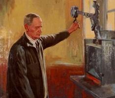 Installation of prize scale at Univ. of Minnesota, n.d. (L-R: Julie Alphonse, team captain; Bernie Brennan, coach; Frank McCormick, Athletic Director.)