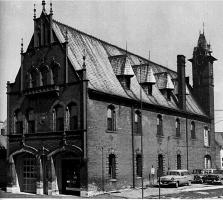 A good description of a volunteer company’s engine house appeared in the Toledo Blade of December 11, 1854: "NEW ENGINE HOUSE - Fire Co. No. 1 have their new engine house nearly completed. It stands on Cherry St., about midway from the corner of Cherry and Summit and the Canal bridge. It is built of brick, two stories high and all the exterior woodwork is covered with sheet iron. On each side of the single front window of the second story is a carved block of grey stone set in brick. On these blocks are representations of a couple trumpets crossed and ‘No. 1’ enclosed in a wreath, these chiseled in relief. This building thou’ small when finished, will be an ornament to Cherry St."