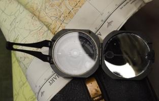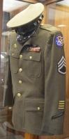 This exhibit case displays an Army Class A uniform (jacket and hat only) with ribbons, service patches, and rank insignia. Also included in the case are a suitcase, map, and and older military compass. Items on loan from the Wood County Historical Society and Canaday Center staff.